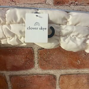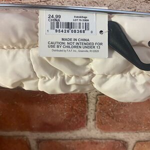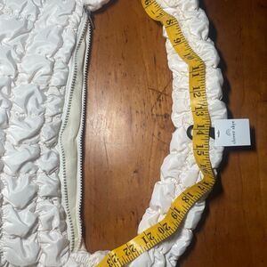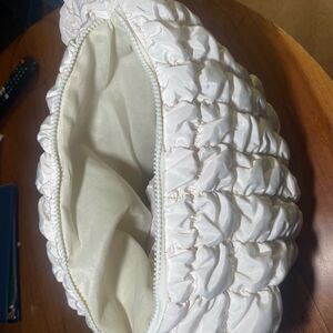 This purse is a rectangular, shoulder-style bag with a thick, padded strap and a ruched, textured surface. The material appears to be soft and quilted, giving it a plush, voluminous look. The color is a neutral cream or ivory, making it versatile and suitable for various outfits. Its structured yet cozy design gives it a handcrafted, contemporary aesthetic.