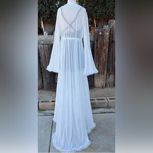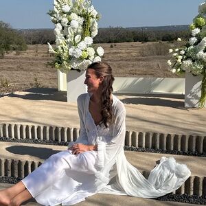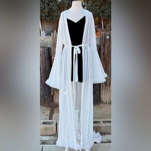 This elegant white sheer robe is perfect for adding a touch of luxury to your intimate wear collection. Its flowing design and delicate fabric offer both comfort and style and is perfect for your wedding morning!!!