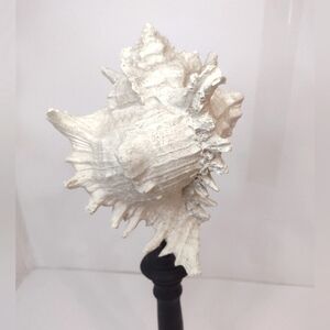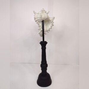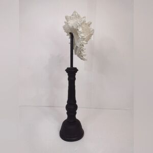 This elegant white shell sculpture is beautifully mounted on a black stand, adding a touch of sophistication to any home decor. Perfect for art enthusiasts, this piece brings a coastal charm to your living space.