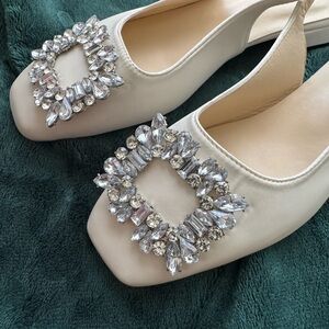 Stylish white slingback flats featuring a sparkling rhinestone buckle. Perfect for adding a touch of elegance to any outfit.