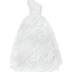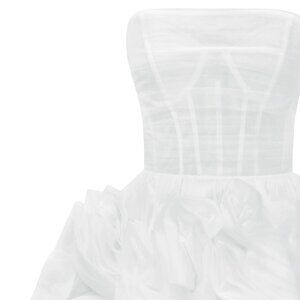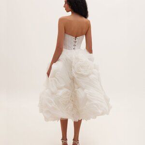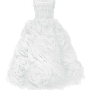 This elegant white strapless midi dress is perfect for any special occasion. Its flowing design offers a sophisticated and timeless look. Worn once for rehearsal dinner.