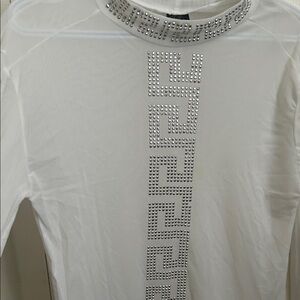 This elegant white top features stunning silver accents for a chic look. Perfect for any occasion.