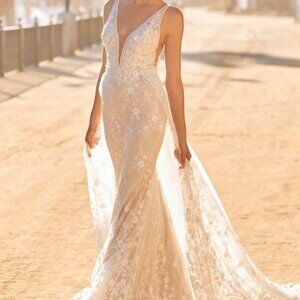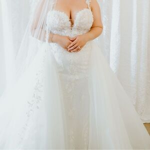 Pronovias Ninfa overskirt in size 6! A beautiful way to turn your form fitting wedding dress into a Cinderella moment and go from one dress look to two. I used this on my wedding day and had a more open concept so the skirt snaps into the wedding dress and doesn’t run over the front waist of your dress.