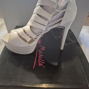 Step out in style with these elegant white heels. Perfect for any special occasion, these shoes offer both style and sophistication. Size 8, all man-made materials.