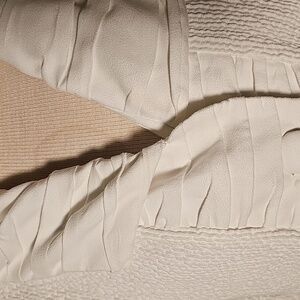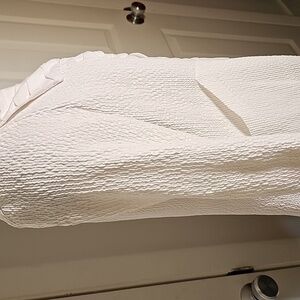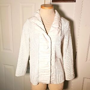 This elegant white jacket is perfect for any occasion. Its sophisticated design adds a touch of class to your wardrobe. 2 covered buttons. size medium. pit to pit flat measurement is 22". The sleeves are 15". the top to bottom length is 24". very good used condition and quality.