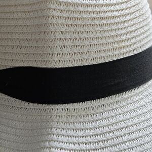 Stay stylish and protected with this elegant white and black sun hat. Perfect for any sunny day outing.
