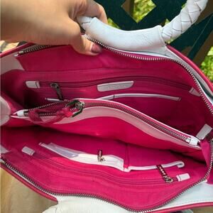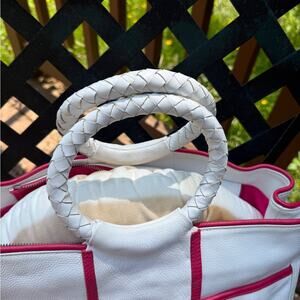 This stylish women's tote bag features a chic white design with striking red accents. Perfect for any occasion, it combines elegance with functionality.