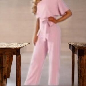 Elegant Wide Leg Jumpsuit Short Sleeve Pink Large