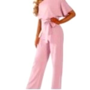 Wide leg jumpsuit, waist tie, keyhole button. Pink.