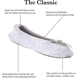 Features: Elegant ballet slipper design with a plush terry cloth exterior, adorned with a charming satin bow. Breathable, soft micro terry lining provides luxurious comfort perfect for lounging or quick outdoor errands. Durable rubber sole makes them suitable for indoor and outdoor wear. Slip-on style for easy on/off, with non-slip stability ensuring safety and confidence with every step. Machine washable for effortless care.