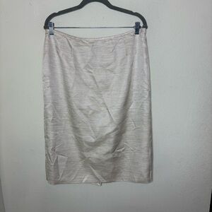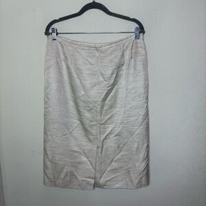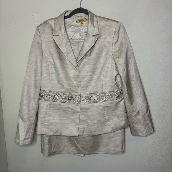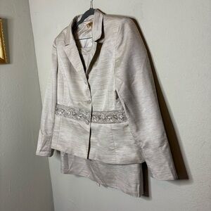 The material has elements of cream and khaki in it. This is a perfect look for a rehearsal dinner, daytime wedding or other special occasion. Beautiful buttons. In very good condition but does need to be ironed (I don't own an iron, sorry!). Both pieces are lined.