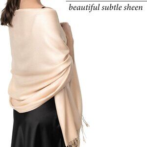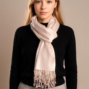 Features: Crafted from a silky-soft viscose-acrylic blend, this pashmina offers a cashmere-like feel with a beautiful drape and subtle sheen. It’s lightweight and generous in size, perfect for dressing up or keeping warm layer by layer. The perfect wrap for evening dresses, casual outings, or travel. Fringed edges add a touch of elegance.