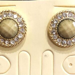 Add a touch of elegance to your outfit with these beautiful elegant Women's Tan Beveled Rhinestone Round Stud Earrings. The earrings are plated with yellow gold and feature a round shape with a beveled edge. The main stone is a brown plastic stone that adds a pop of color to the earrings.