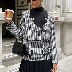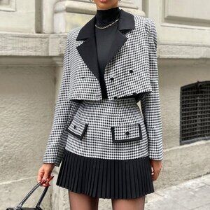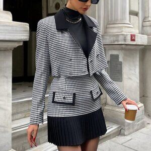 Elegant Women's Houndstooth Pattern Suit jacket & Pleated Skirt