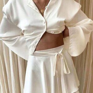 Elegant Women's Long Sleeve Cropped Blouse & Self-Tie Waist Skirt set