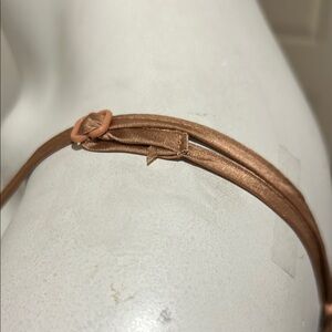 This elegant one-shoulder dress is perfect for any occasion. The tan color adds a touch of sophistication to your wardrobe. Enjoy the comfort and style of this beautifully designed piece. Adjustable strap. Pockets. Coppery satin. Pre owned. Layer of hem coming unstitched. No hole.