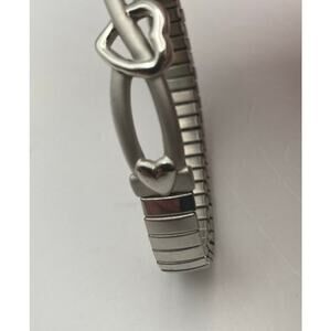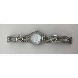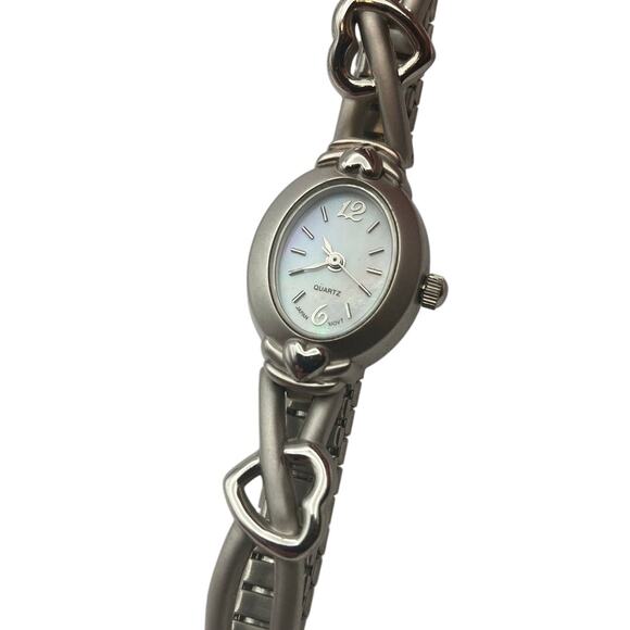 Elegant Womens Pearl Like Quartz Watch Stretch Band w/ Hearts New Battery in good pre-owned working condition-please see all photos-small imperfections
