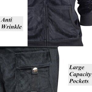 Features: This 2-piece set includes a comfortable hoodie with large kangaroo pockets, a smooth zipper, and ribbed hem, paired with matching joggers featuring an elastic waist with an adjustable strap, plus front and back pockets with buttons—ideal for storing your essentials. Soft, plush velour fabric adds a touch of luxury to your casual look.