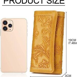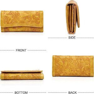 This stylish yellow embossed wallet is perfect for any occasion. Its intricate design adds a touch of elegance to your ensemble.