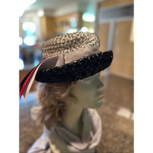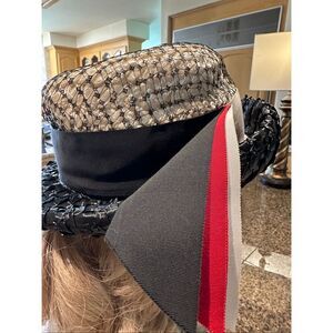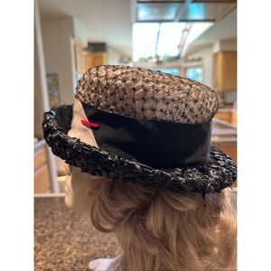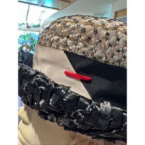 Stylish women's hat featuring a chic black and gray design. Perfect for adding a touch of elegance to any outfit. I really adore, adore, adore this hat; it’s just like the boaters that started Chanel on her path to fashion and greatness. She almost always included boaters in her collections. It’s just the greatest hat – – if only it fit my enormous head!