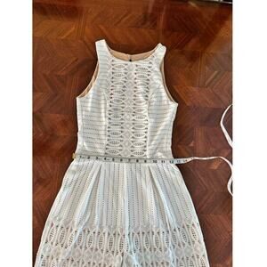 Sleeveless design with intricate cutout lace overlay and nude lining