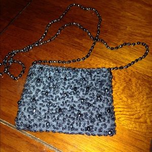 Gift w/ purchase!! Thick and lined black fabric w/ beads and beaded strap. Lovely little bag for a night out🍾. Strap is long enough to wear cross body or tuck inside to create a super elegant little makeup bag 💖