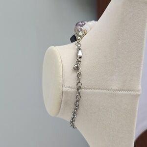 This stunning 4 strand necklace features a blend of black, white,pink and purple beads. Perfect for adding a touch of elegance to any outfit.