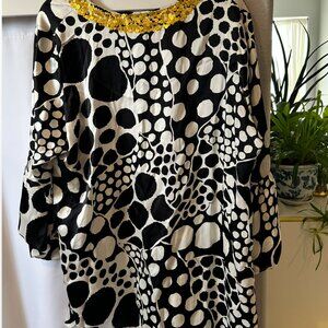 Fantastic, elegant, and beautiful black and white patterned silk with gold sequin detail around the neck of the tunic. US18/UK22 designer Anna Scholz. Falls upper thigh length—gorgeous 100% silk.