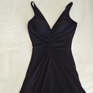 Beautifully ruched black dress, built in bra pads, lined for great panty coverage, back zip with deep v-back, fit and flare style. You will wear this dress a lot!