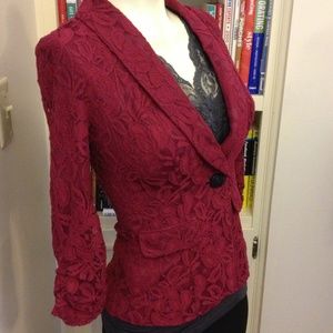 Burgundy blazer with decorative button closure. Two faux pockets in the front. 3/4 sleeves with gathered fabric as pictured. Perfect addition to any top and skirt for a classy and sophisticated look! Extra button included.