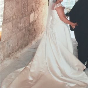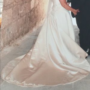 From The Bridal Collection store in Thousand Oaks. Elegant , well made, creme color wedding dress. Lace arm straps. Beaded lace over chest. Lace up corset tieback, sexy part open back. Worn once. preserved boxed since a few days after the wedding.