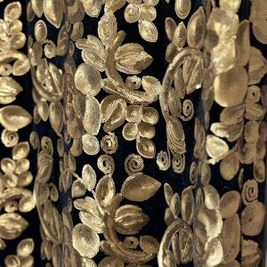Refined black bodice with gorgeous floral enbrodered sequined skirt on black background. Flattering column silhouette. Worn once and in new condition.