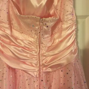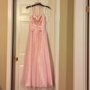 Size 3, pink formal dress. Halter top, silver embellishments and ruffled belt at waist line. Only been worn twice and in brand new condition!
