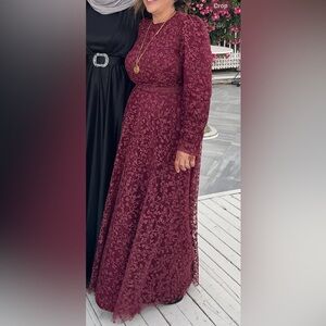 Elegant formal modest gown Red burgundy sparkly Lace Women Dress sz 8