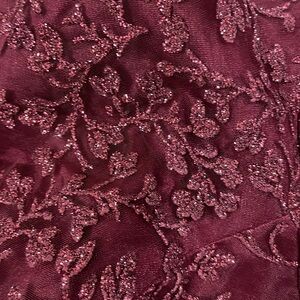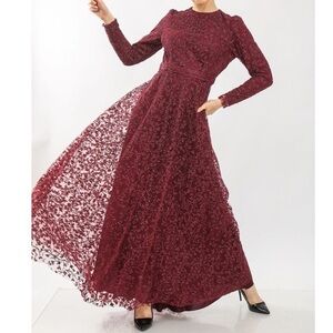 This elegant formal modest gown is a sparkling burgundy beauty! Features a beautiful, glittery floral vine pattern throughout with a waistband to match. Perfect for formal events! Size 42 EUR or size 8 US