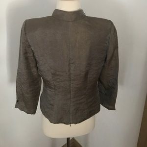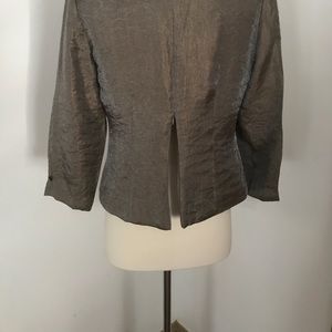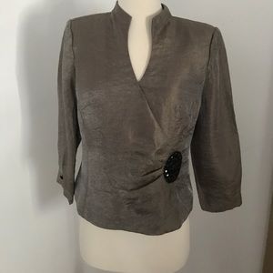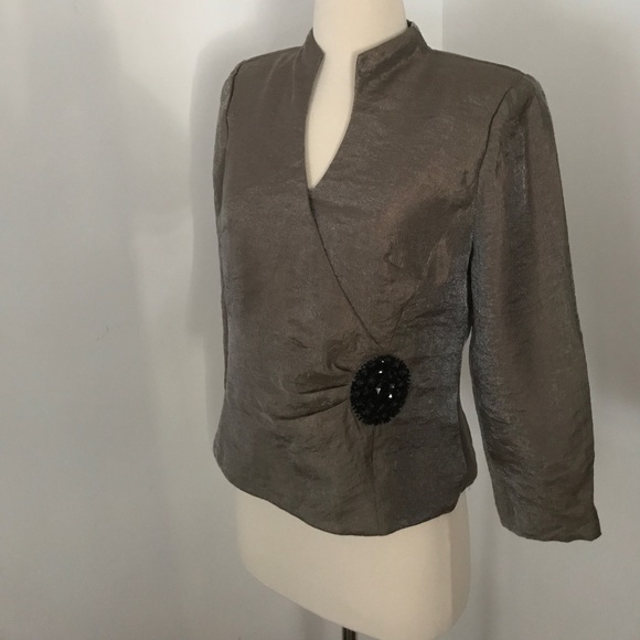 Elegant jacket by Carol Lin. Pair with black palazzo pants or velvet skirt for a formal or holiday look. Beautiful beaded patch detail in front. Zip back. Can be worn slightly open for a bit of sex appeal. Material has a sheen and looks bronzy. Size 8. Excellent condition.