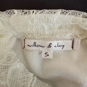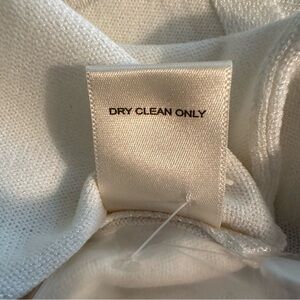 This elegant, lightweight knit cream sweater features a delicate lace neckline and soft ruffle details. Slightly bell shape to sleeves. New without tags. Dry-clean only. S
