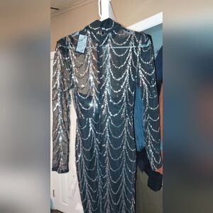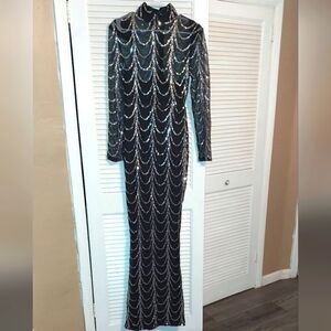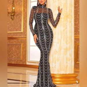 hand Sequined Contrast Mesh Formal Dress, Elegant Long Sleeve Slim Evening Dress For Party & banquet very detailed gown and amazing high quality fabric.