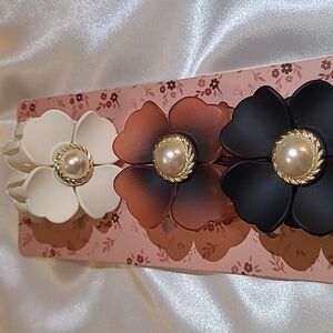 Enhance your style with this elegant set of floral hair clips. Featuring cream, brown, and black colors, each clip is adorned with a pearl center for a touch of sophistication. Perfect for any occasion. -NWOT