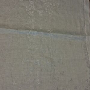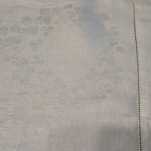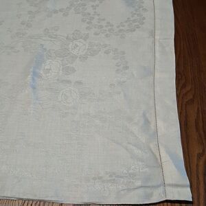 Elegant vintage white damask design Table Runner. 21.5" W X 48" L.. Damask runner has subtle floral patterns. Perfect for adding a touch of elegance to your dining table. This could also be used as a vintage dresser scarf. Preowned. Non smoking home. No stains or rips. Excellent condition.