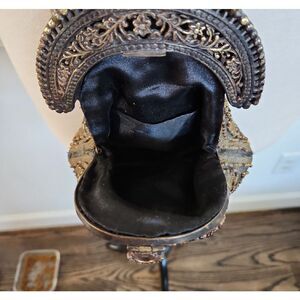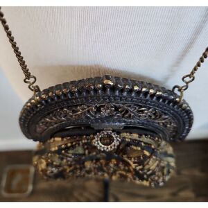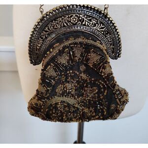 This exquisite evening bag features intricate black and gold beadwork, perfect for adding a touch of elegance to any outfit. Ideal for special occasions.
