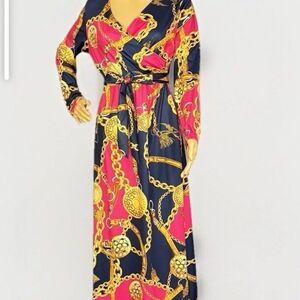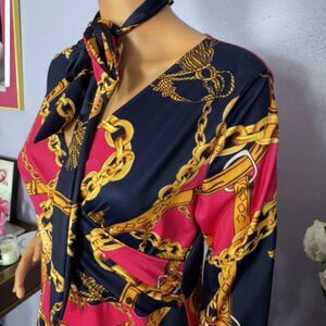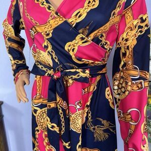 This elegant wrap dress features a striking chain print design. The vibrant pink and black colors make it a standout piece for any occasion. Perfect for adding a touch of sophistication to your wardrobe.