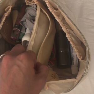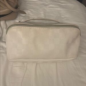 This stylish cream checkered bag is perfect for traveling. Photos of inside are to show the pockets and space. Bag does not come with any makeup or products. Spacious interior and elegant design makes it a versatile accessory for your wardrobe.