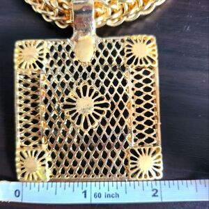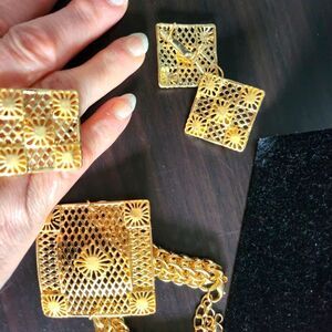 This stunning goldtone jewelry set features a beautifully crafted necklace with large 2" art deco design with matching bracelet, earrings and ring. Ring is size 7 but can be adjusted, earrings are pierced. Perfect for adding a touch of elegance to any outfit.
