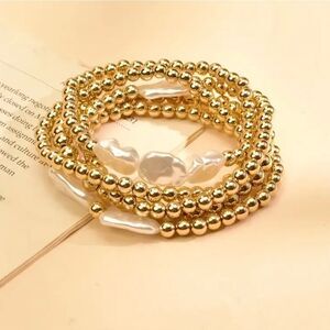 Elegant Gold Beaded Faux Pearl Bracelet Set ~ 5 Pieces