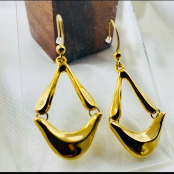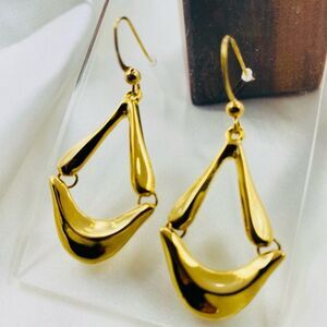These elegant gold drop earrings add a touch of sophistication to any outfit. Perfect for any occasion. Stunning gold statement dangle earrings perfect for adding a touch of elegance to any outfit. These unique earrings feature a modern, abstract design with smooth, curved lines. They are lightweight and comfortable to wear for extended periods.