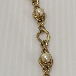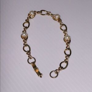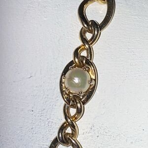 This elegant bracelet features a stunning combination of gold links and lustrous pearls, perfect for adding a touch of sophistication to any outfit.
