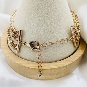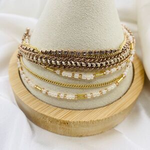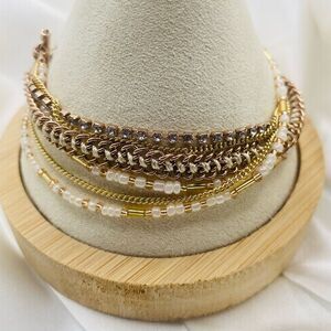 This elegant bracelet set features a stunning combination of gold and silver tones, perfect for adding a touch of sophistication to any outfit. Ideal for both casual and formal occasions. This stunning multi-strand bracelet set is perfect for adding a touch of elegance to any outfit. It features a unique combination of delicate beaded strands and gold and rose gold chains, creating a layered look that's both stylish and sophisticated.