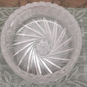 Elegant Heavy Cut Glass sawtooth rim 7" Bowl Pinwheel & Star of David Center Pattern. Has sunflower/daisy pattern etched in sides. Frosted look.