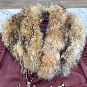 Step out in style with this elegant maroon leather jacket, featuring a plush faux fur collar. A perfect blend of sophistication and warmth.